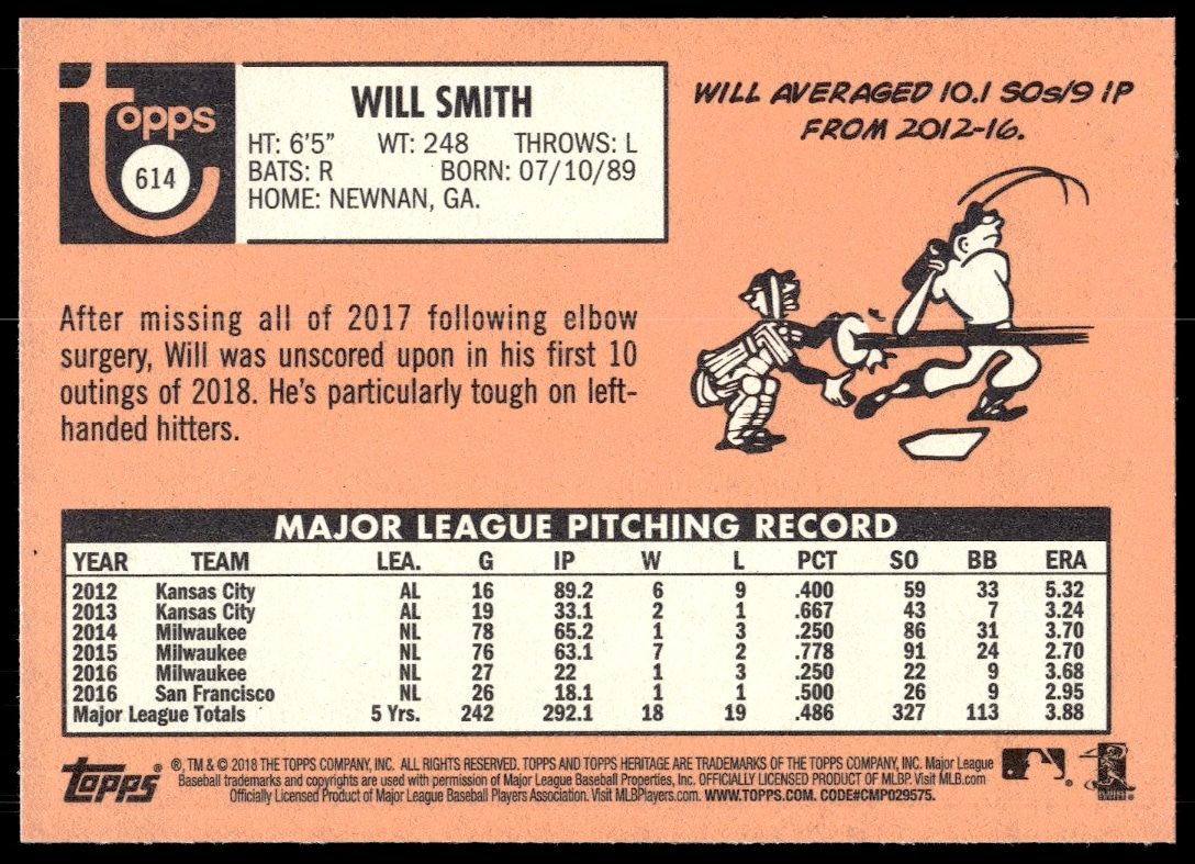 This BaseballΒ card, from 2018 is part of the Topps Heritage High NumberΒ card set. Will Smith is featured and has a card number of 614.