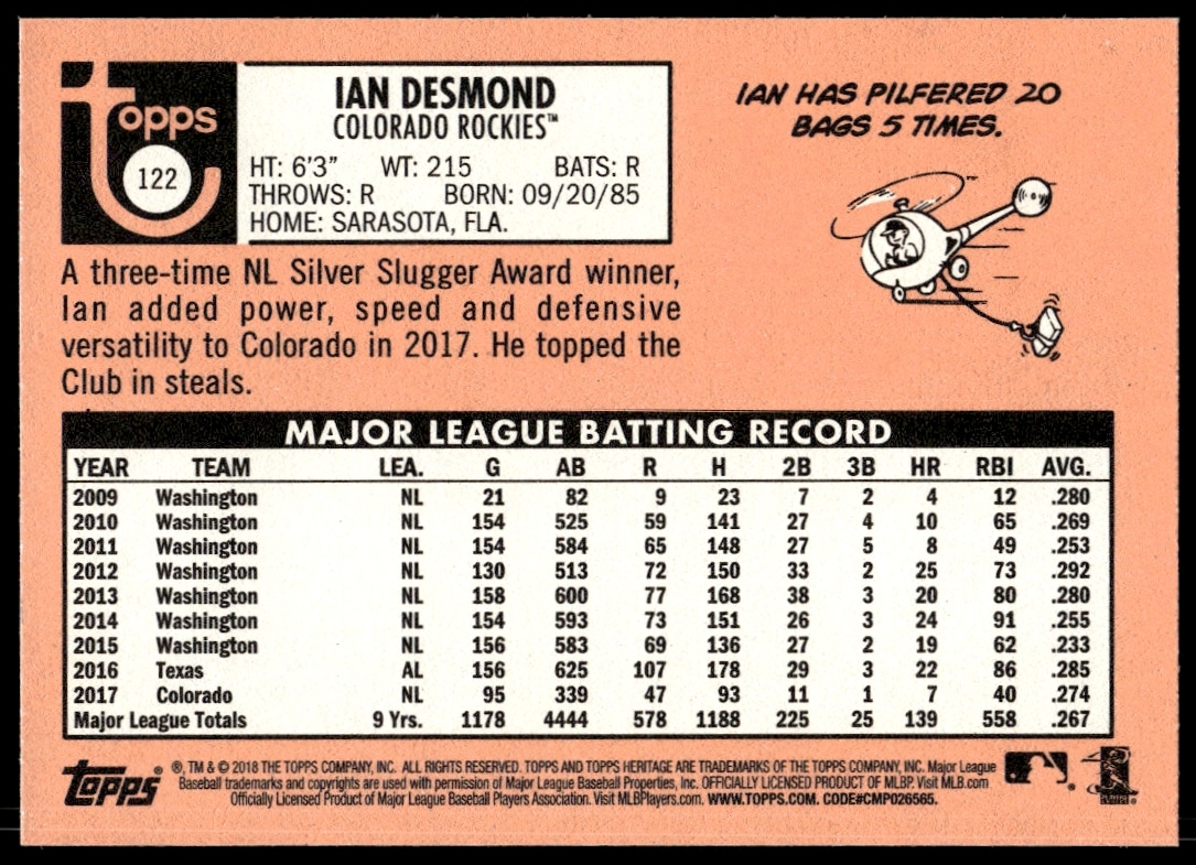 This BaseballΒ card, from 2018 is part of the Topps HeritageΒ card set. Ian Desmond is featured and has a card number of 122.