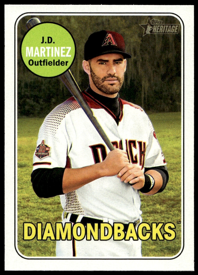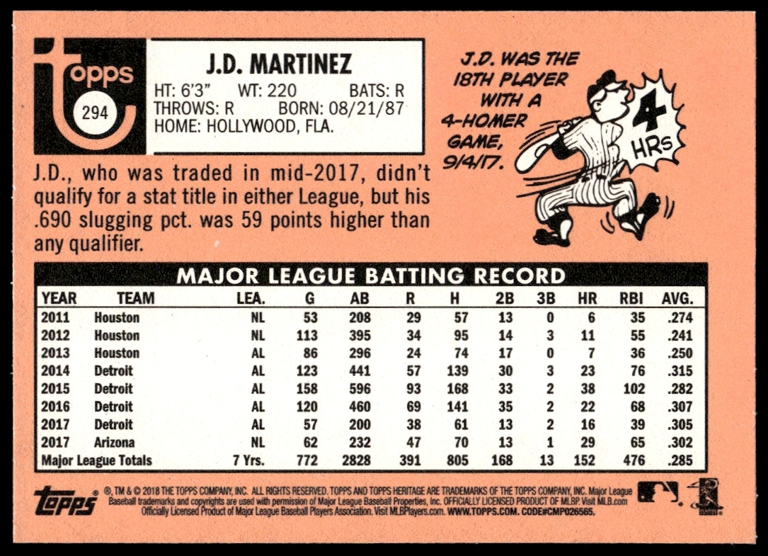 This Baseball card, from 2018 is part of the Topps Heritage card set. J.D. Martinez is featured and has a card number of 294.