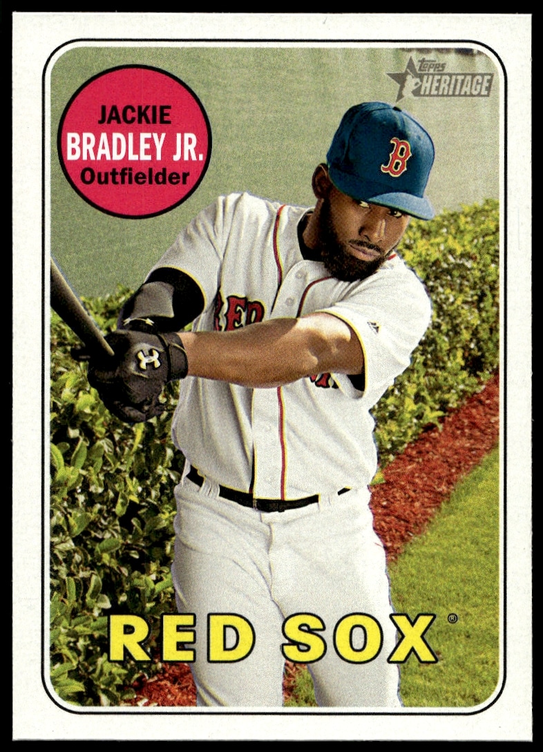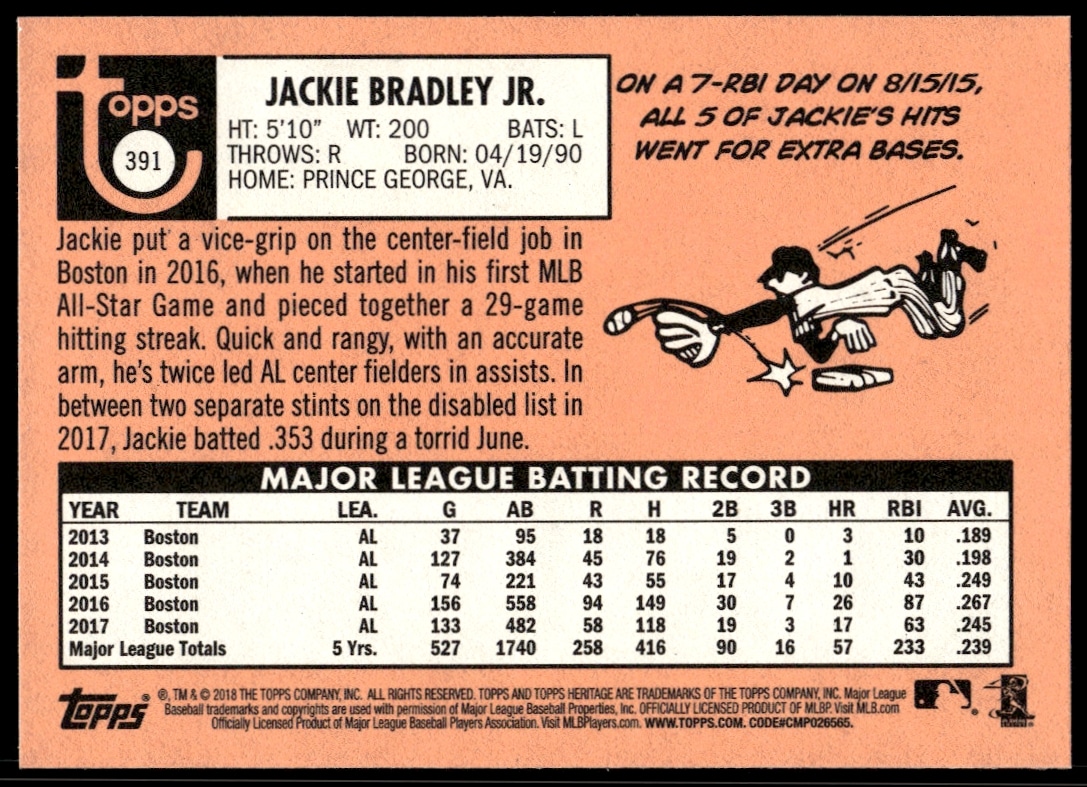This Baseball card, from 2018 is part of the Topps Heritage card set. Jackie Bradley Jr. is featured and has a card number of 391.