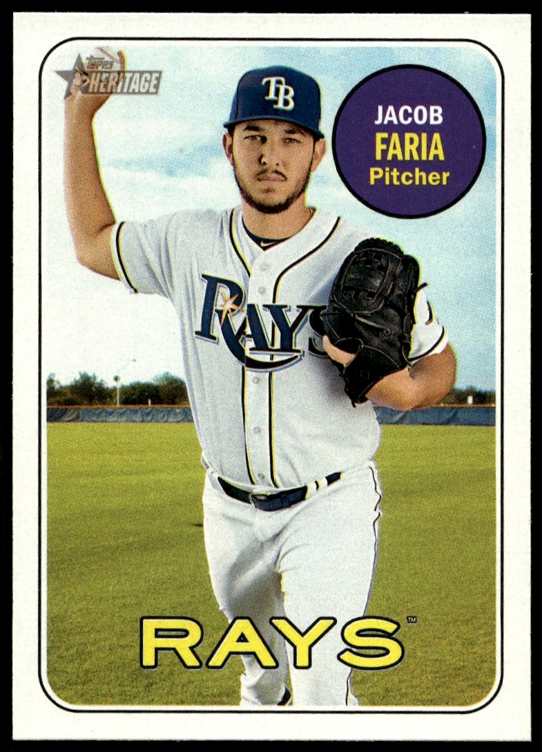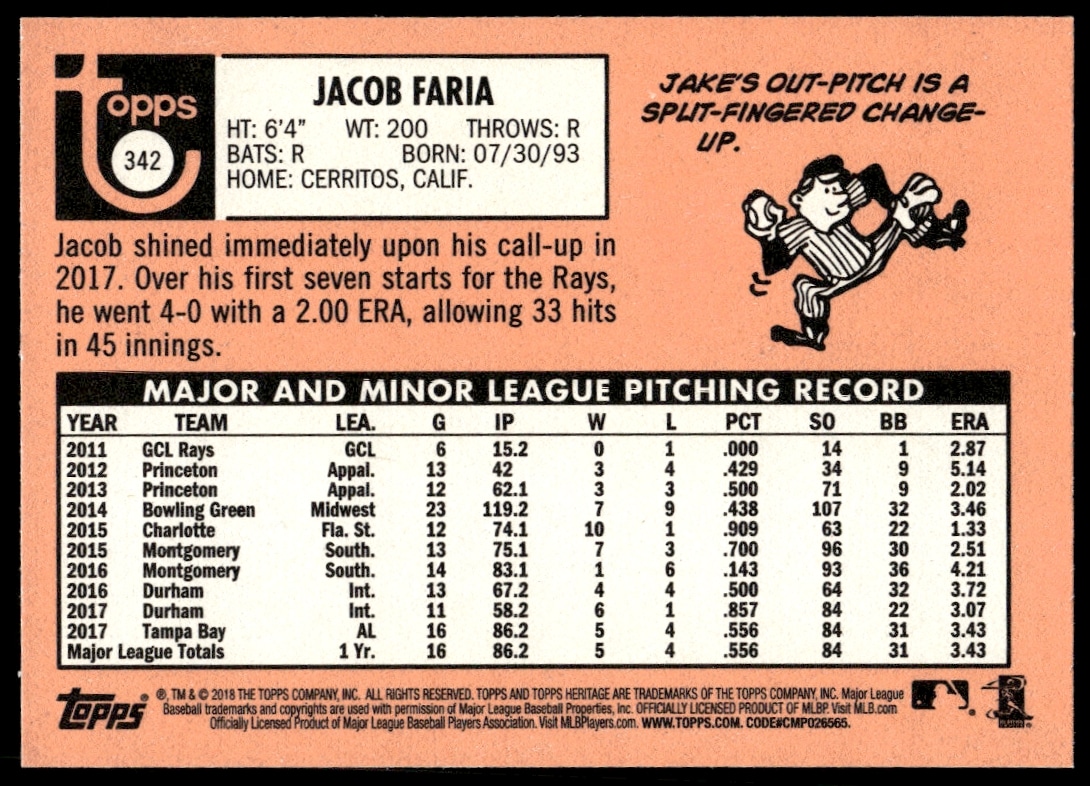 This BaseballΒ card, from 2018 is part of the Topps HeritageΒ card set. Jacob Faria is featured and has a card number of 342.