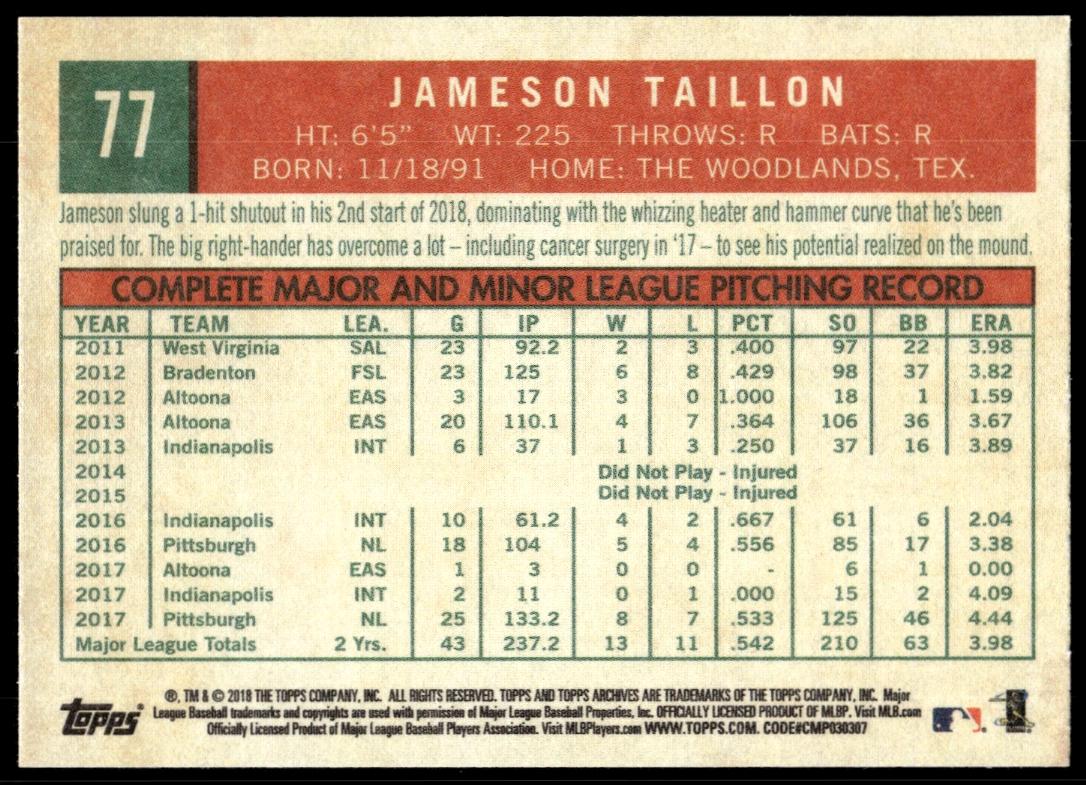 This BaseballΒ card, from 2018 is part of the Topps HeritageΒ card set. Jameson Taillon is featured and has a card number of 77.