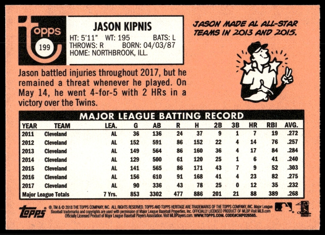 This Baseball card, from 2018 is part of the Topps Heritage card set. Jason Kipnis is featured and has a card number of 199.