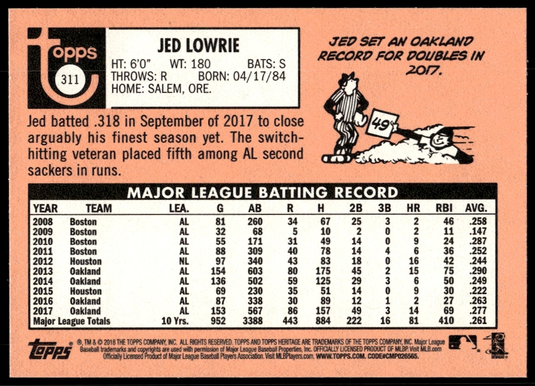 This Baseball card, from 2018 is part of the Topps Heritage card set. Jed Lowrie is featured and has a card number of 311.