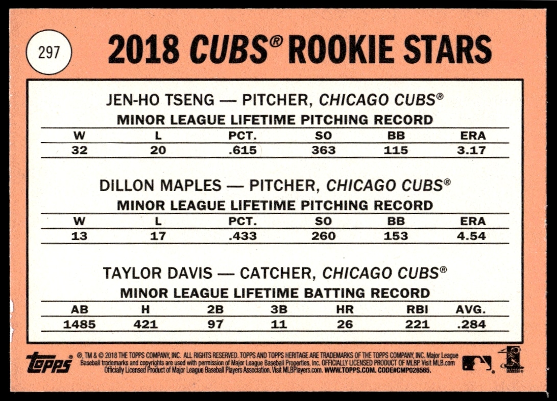 This Baseball card, from 2018 is part of the Topps Heritage card set. Jen-Ho Tseng / Dillon Maples / Taylor Davis PR50 is featured and has a card number of 297.