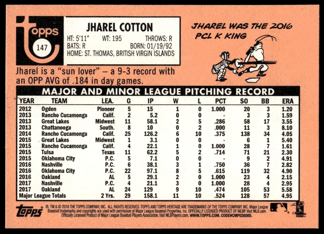 This BaseballΒ card, from 2018 is part of the Topps HeritageΒ card set. Jharel Cotton is featured and has a card number of 147.
