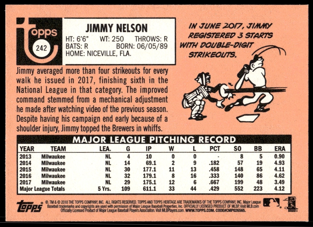 This BaseballΒ card, from 2018 is part of the Topps HeritageΒ card set. Jimmy Nelson is featured and has a card number of 242.