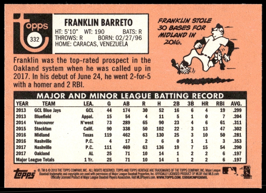 This Baseball card, from 2018 is part of the Topps Heritage card set. Joey Votto is featured and has a card number of 332.