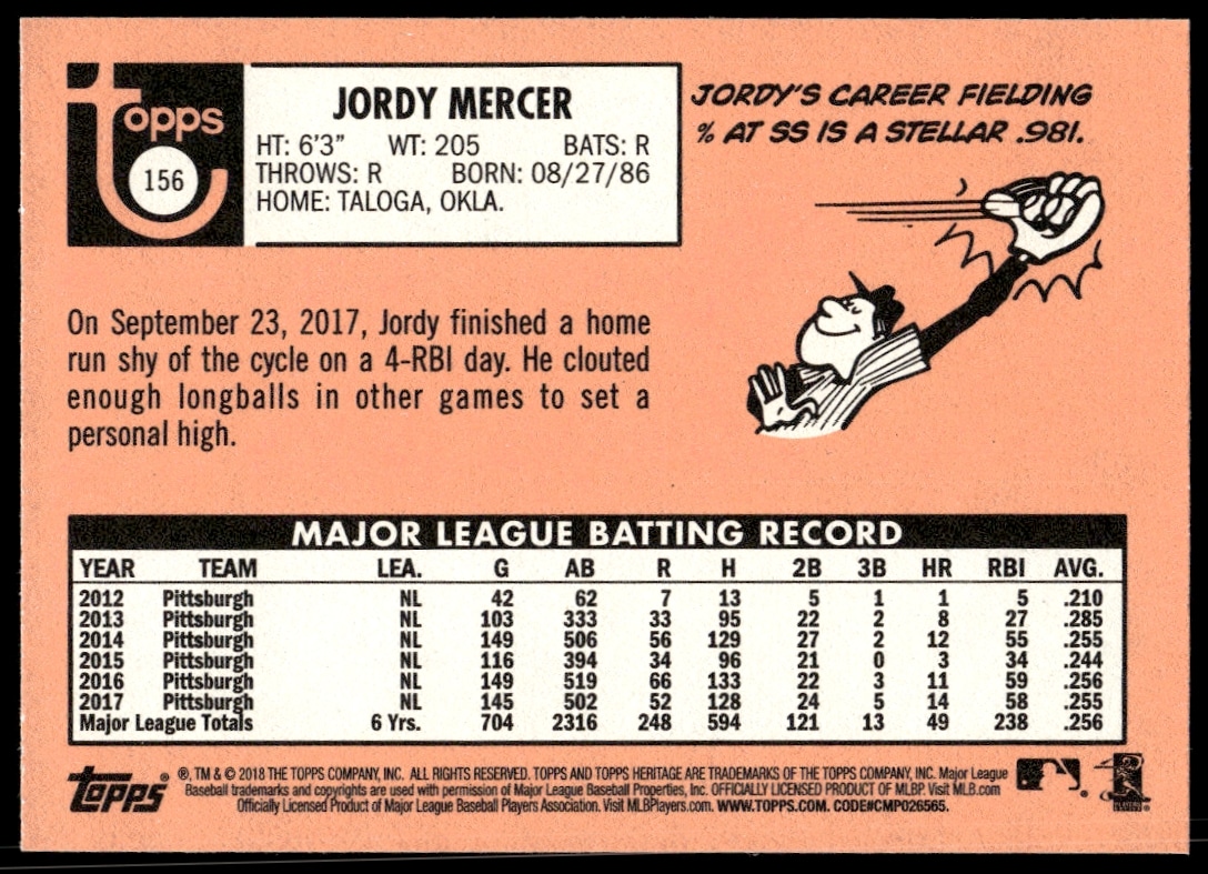 This BaseballΒ card, from 2018 is part of the Topps HeritageΒ card set. Jordy Mercer is featured and has a card number of 156.