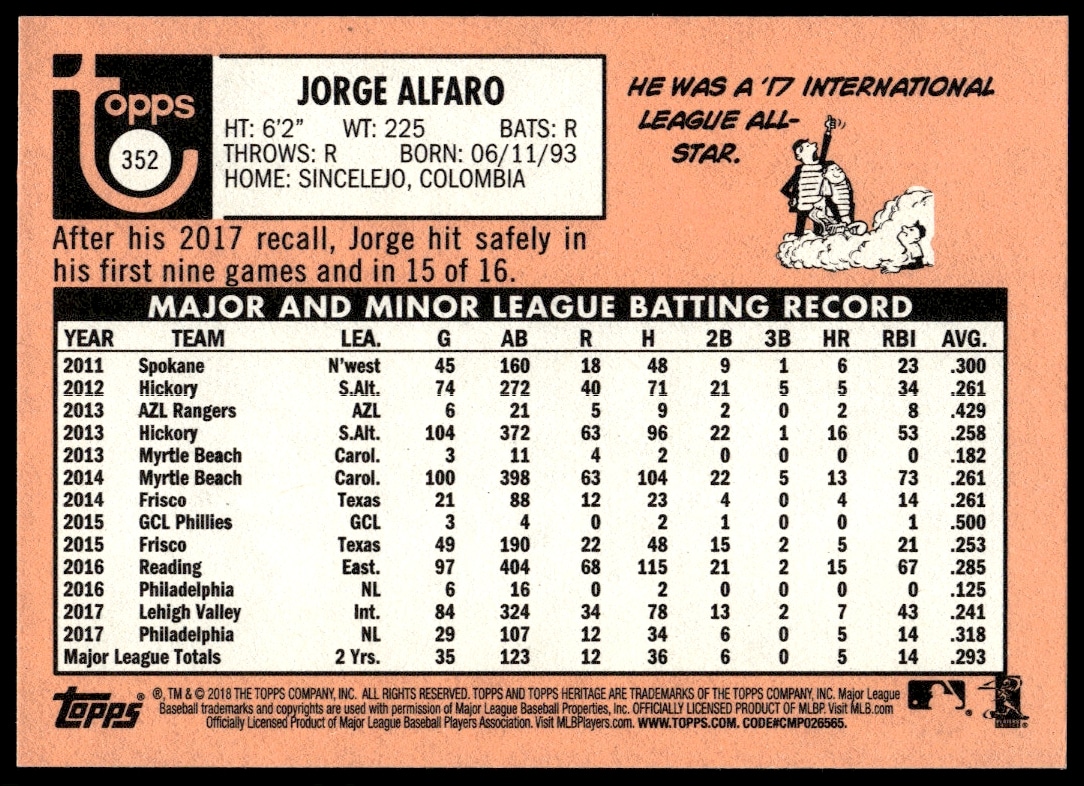 This BaseballΒ card, from 2018 is part of the Topps HeritageΒ card set. Jorge Alfaro is featured and has a card number of 352.
