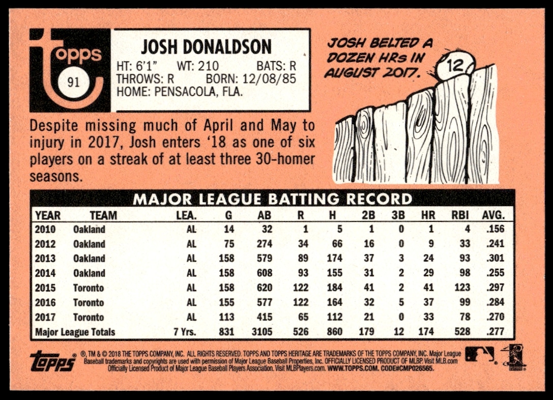 This Baseball card, from 2018 is part of the Topps Heritage card set. Josh Donaldson is featured and has a card number of 91.