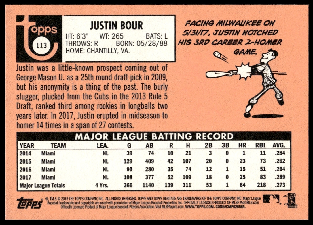 This Baseball card, from 2018 is part of the Topps Heritage card set. Justin Bour is featured and has a card number of 113.