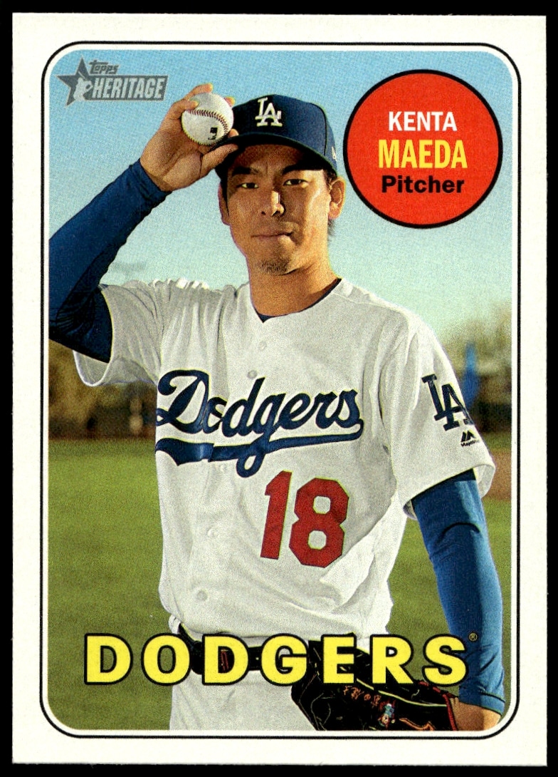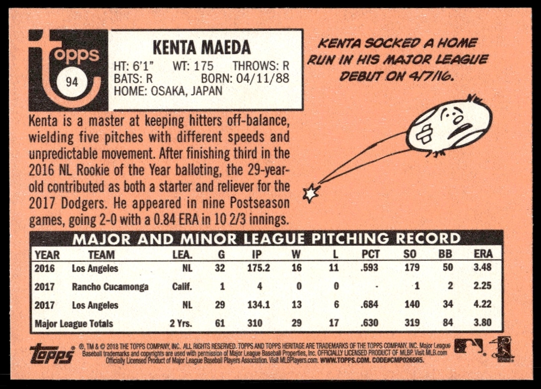 This Baseball card, from 2018 is part of the Topps Heritage card set. Kenta Maeda is featured and has a card number of 94.