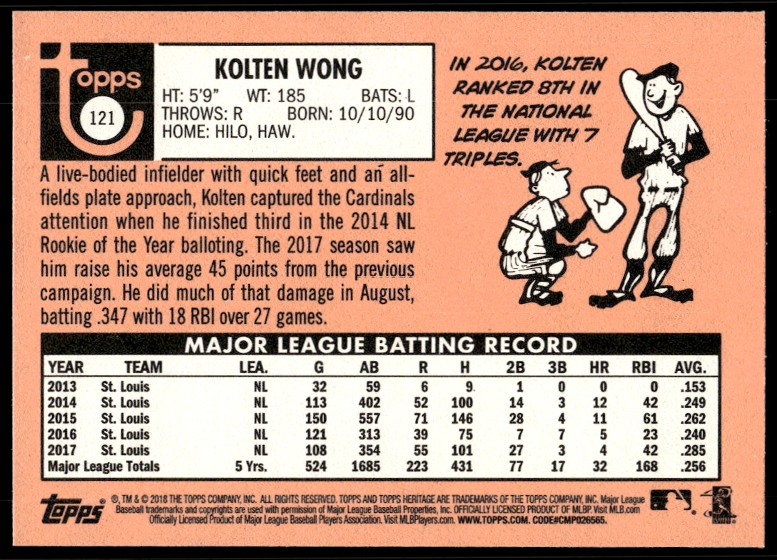 This Baseball card, from 2018 is part of the Topps Heritage card set. Kolten Wong is featured and has a card number of 121.
