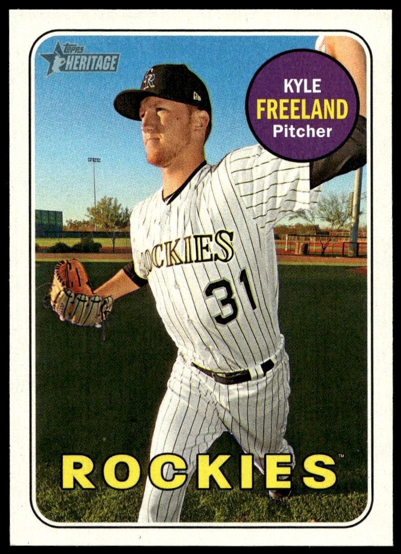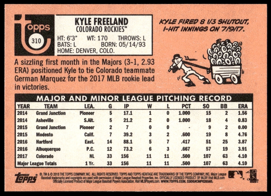 This Baseball card, from 2018 is part of the Topps Heritage card set. Kyle Freeland is featured and has a card number of 310.