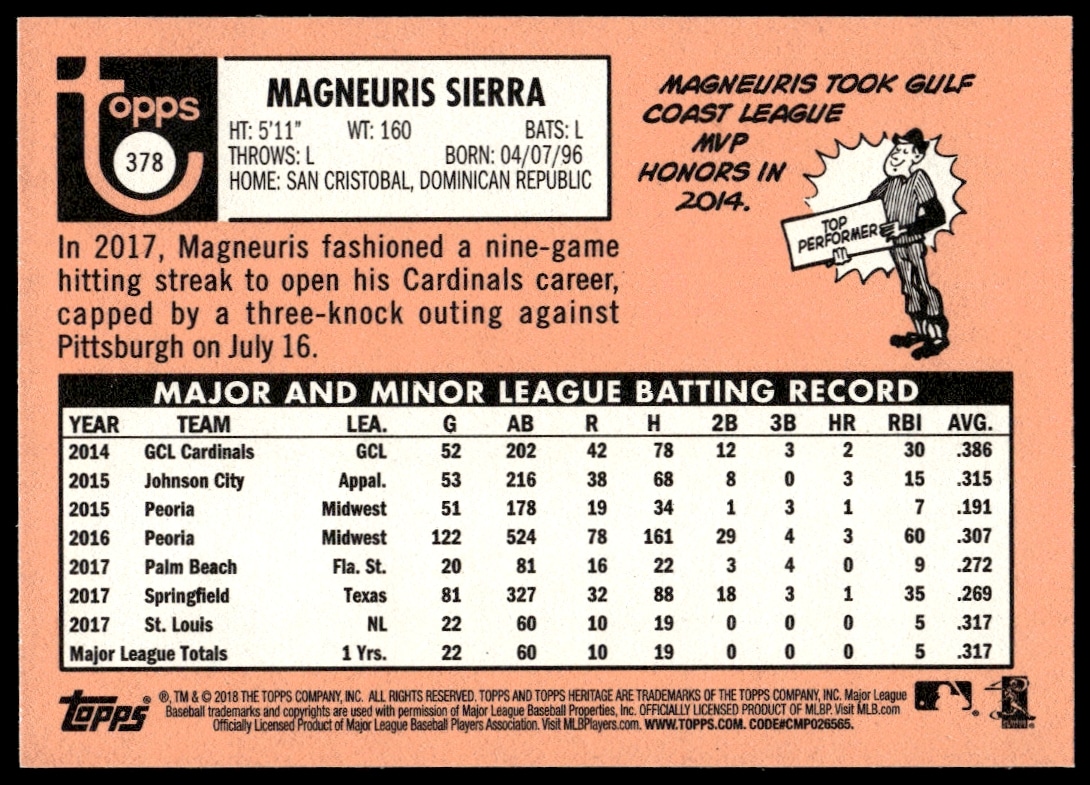 This Baseball card, from 2018 is part of the Topps Heritage card set. Magneuris Sierra is featured and has a card number of 378.