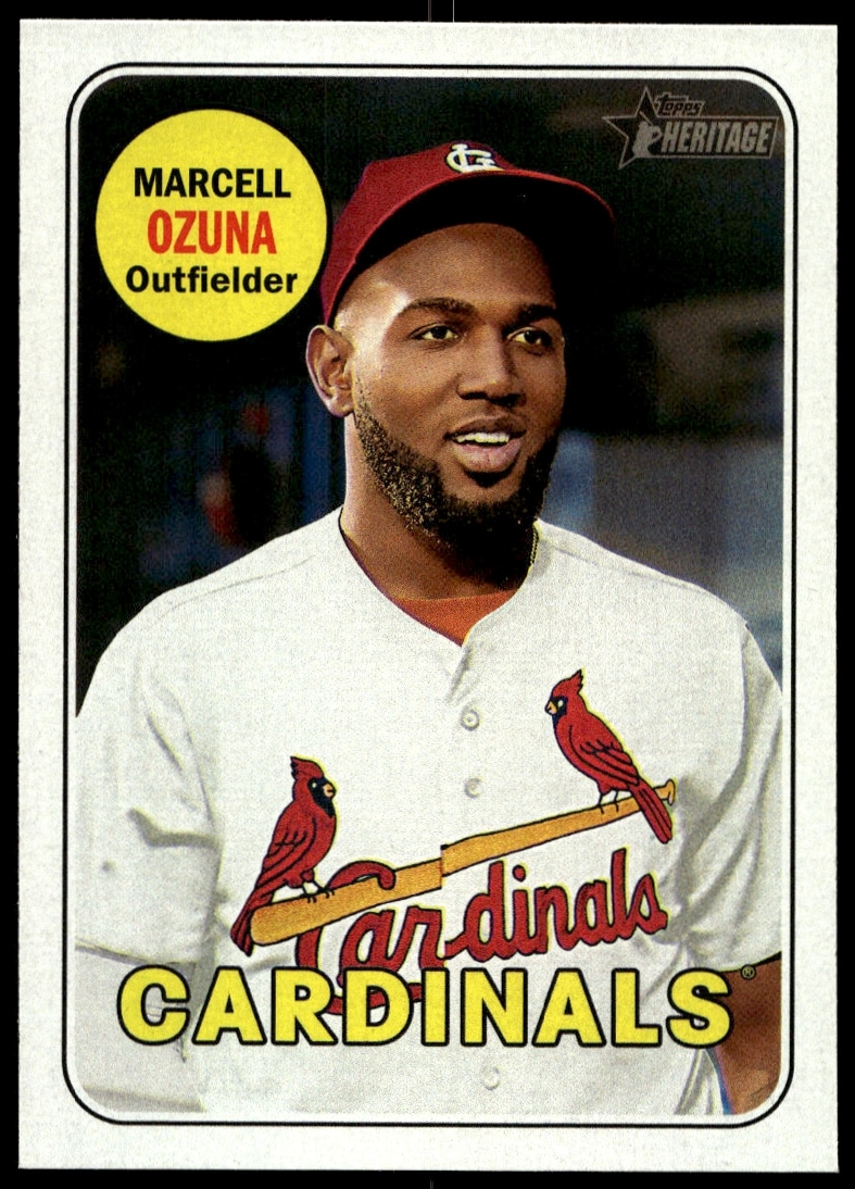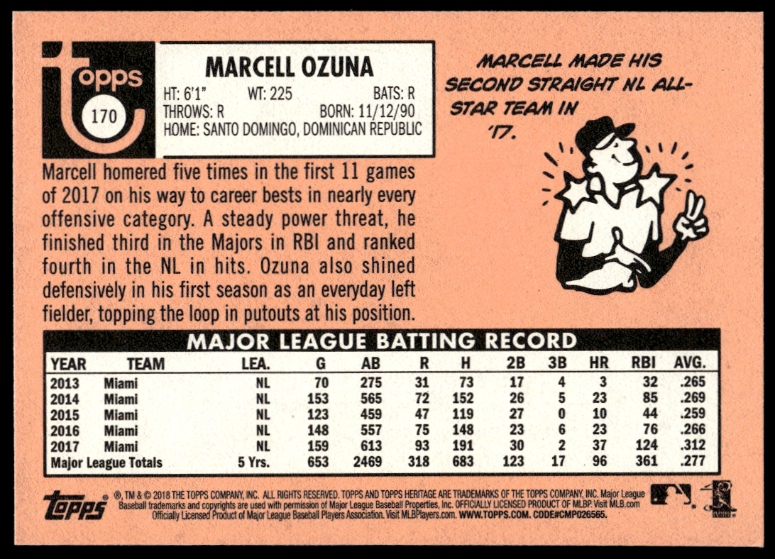 This Baseball card, from 2018 is part of the Topps Heritage card set. Marcell Ozuna is featured and has a card number of 170.
