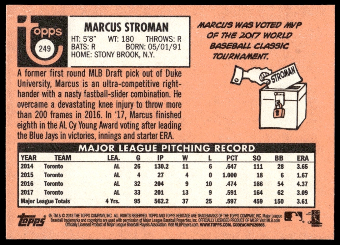 This Baseball card, from 2018 is part of the Topps Heritage card set. Marcus Stroman is featured and has a card number of 249.