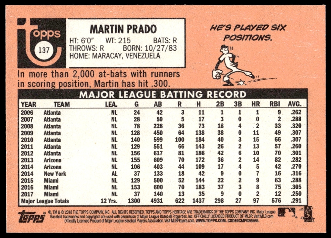 This Baseball card, from 2018 is part of the Topps Heritage card set. Martin Prado is featured and has a card number of 137.