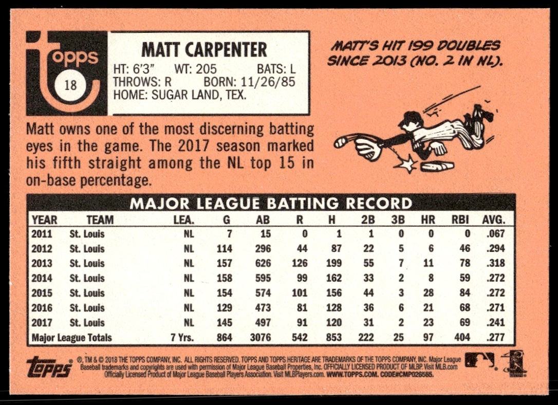 This BaseballΒ card, from 2018 is part of the Topps HeritageΒ card set. Matt Carpenter is featured and has a card number of 18.