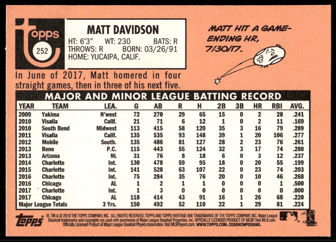 This BaseballΒ card, from 2018 is part of the Topps HeritageΒ card set. Matt Davidson is featured and has a card number of 252.