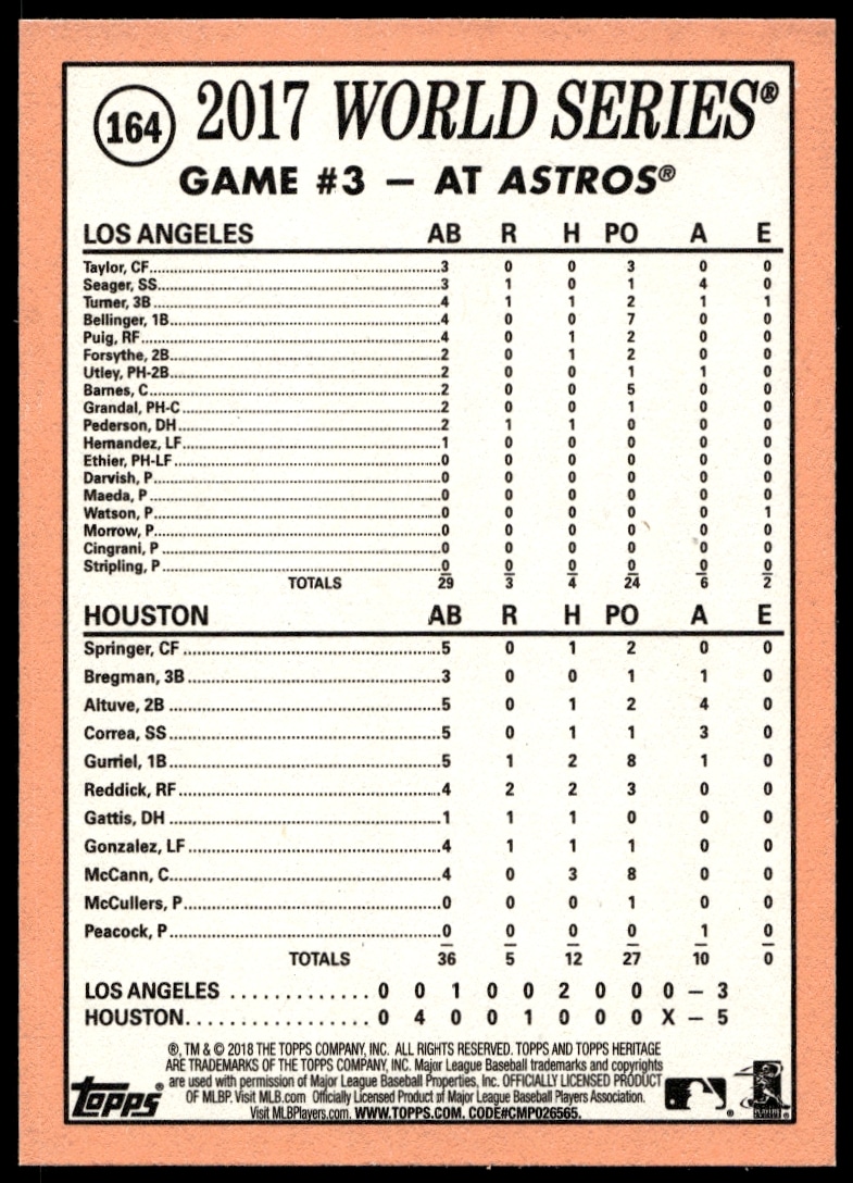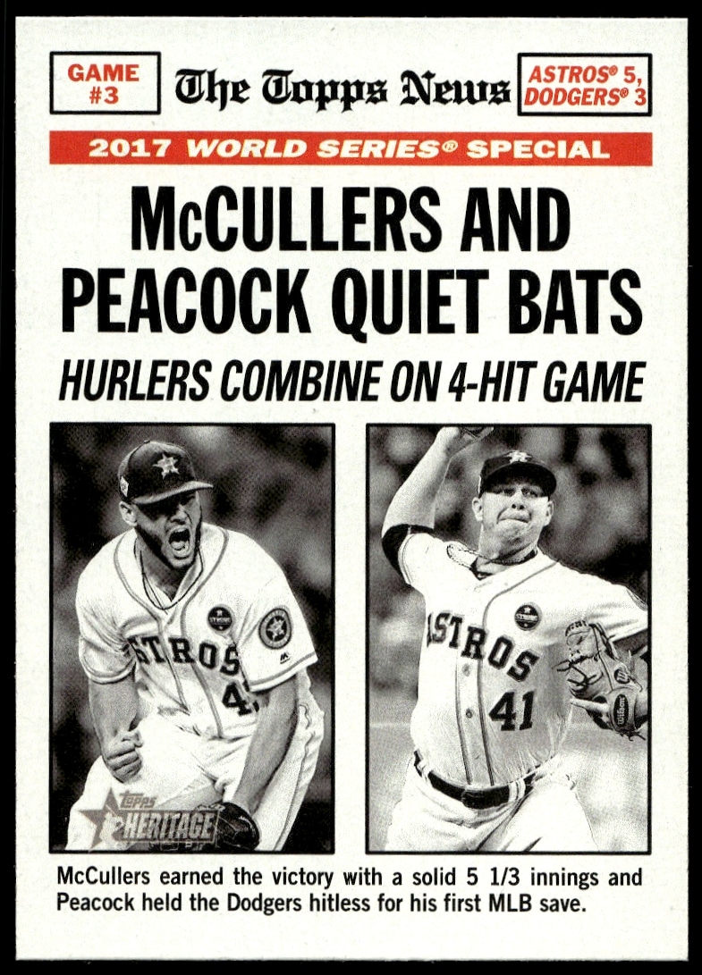 This BaseballΒ card, from 2018 is part of the Topps HeritageΒ card set. McCullers and Peacock Quiet Bats (Lance McCullers, Jr. / Brad Peacock) is featured and has a card number of 164.