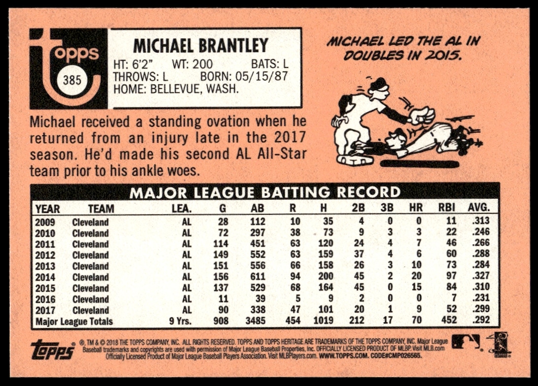 This Baseball card, from 2018 is part of the Topps Heritage card set. Michael Brantley is featured and has a card number of 385.