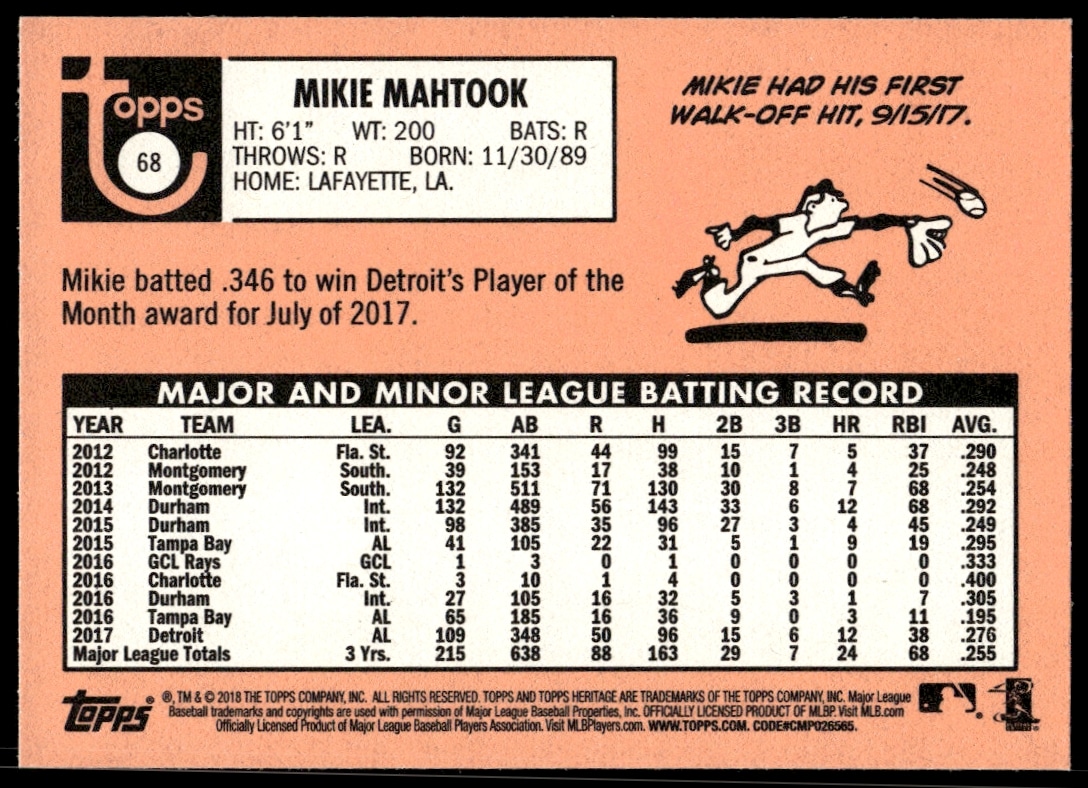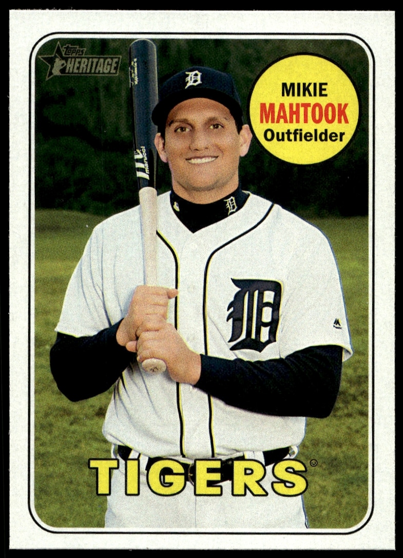 This BaseballΒ card, from 2018 is part of the Topps HeritageΒ card set. Mikie Mahtook is featured and has a card number of 68.