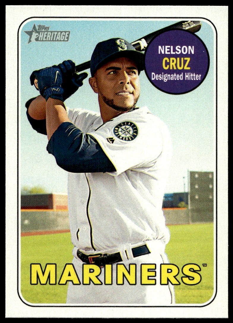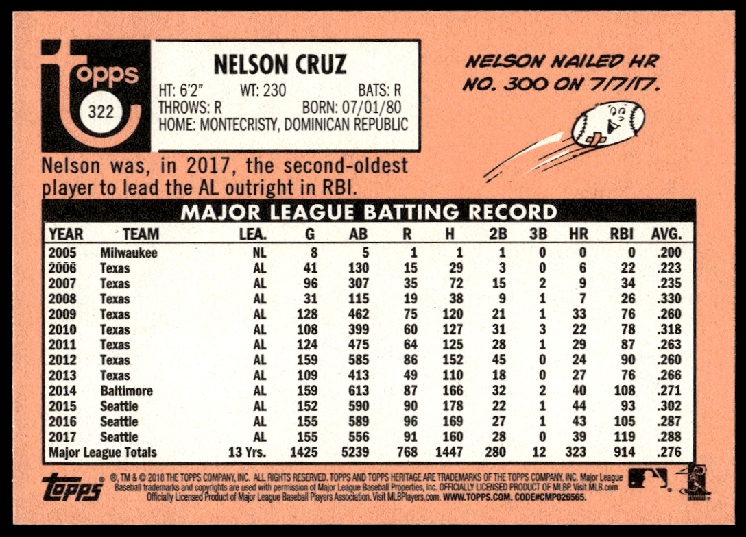 This Baseball card, from 2018 is part of the Topps Heritage card set. Nelson Cruz is featured and has a card number of 322.