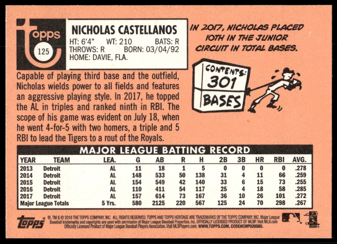 This Baseball card, from 2018 is part of the Topps Heritage card set. Nicholas Castellanos is featured and has a card number of 125.