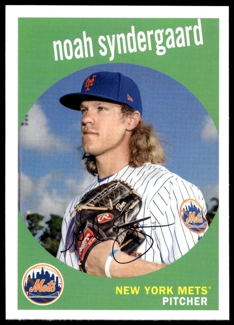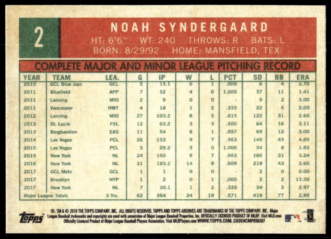 This BaseballΒ card, from 2018 is part of the Topps HeritageΒ card set. Noah Syndergaard is featured and has a card number of 2.