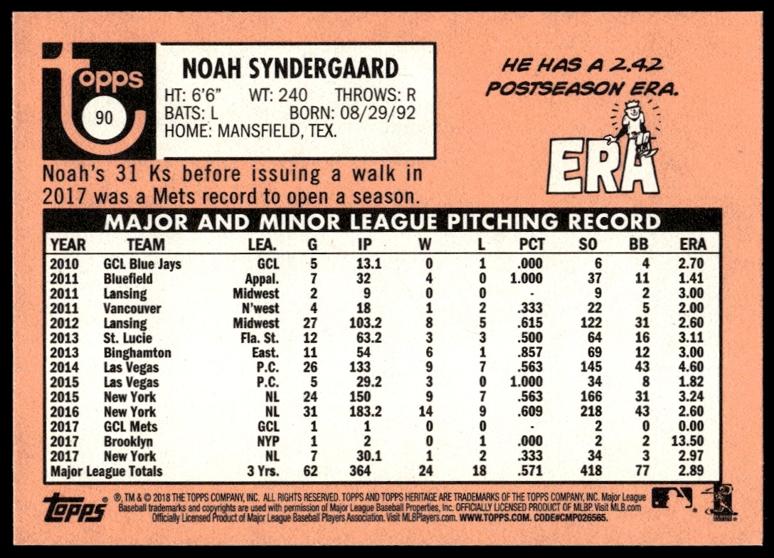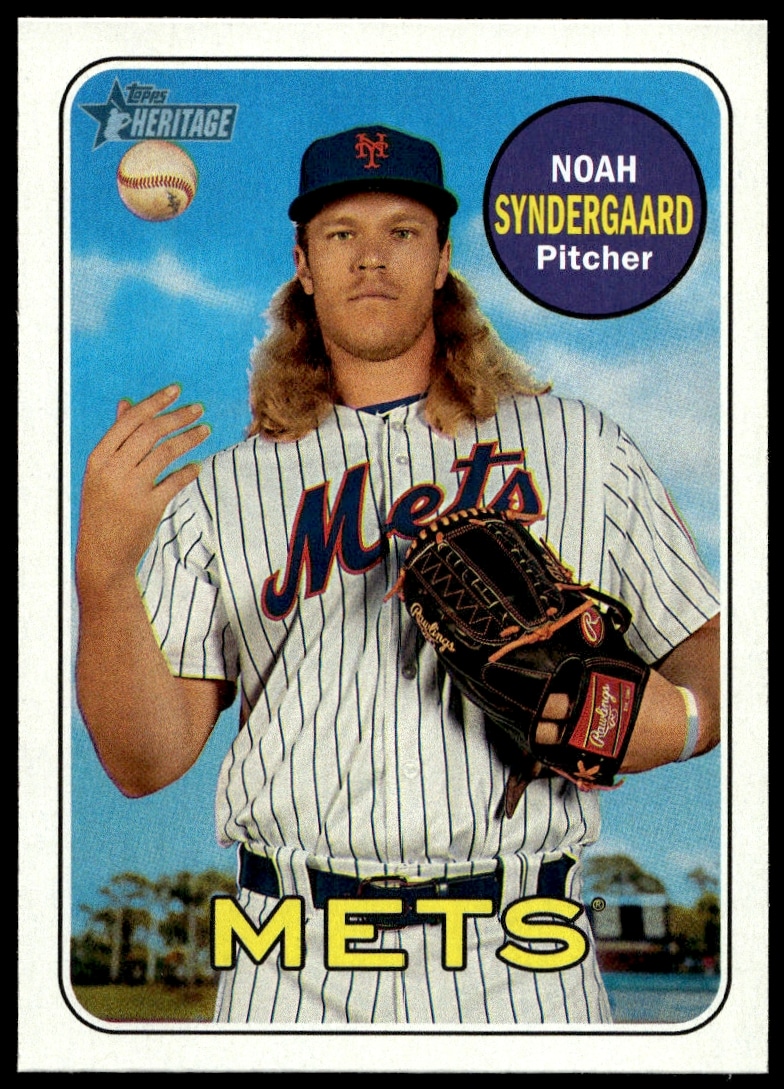 This Baseball card, from 2018 is part of the Topps Heritage card set. Noah Syndergaard is featured and has a card number of 90.