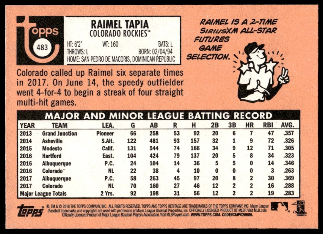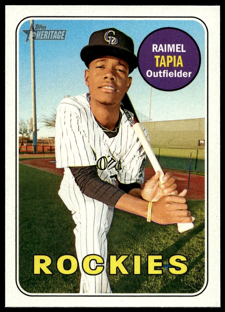 This BaseballΒ card, from 2018 is part of the Topps HeritageΒ card set. Raimel Tapia is featured and has a card number of 483.