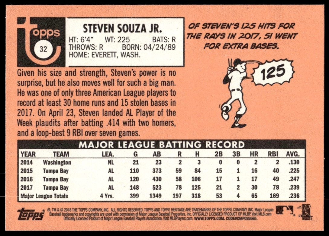 This BaseballΒ card, from 2018 is part of the Topps HeritageΒ card set. Steven Souza Jr. is featured and has a card number of 32.