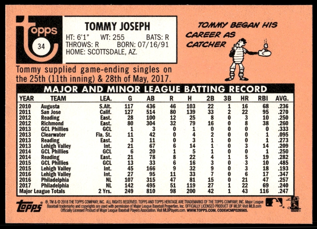 This Baseball card, from 2018 is part of the Topps Heritage card set. Tommy Joseph is featured and has a card number of 34.