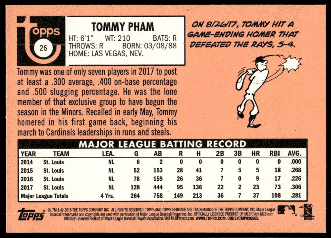 This Baseball card, from 2018 is part of the Topps Heritage card set. Tommy Pham is featured and has a card number of 26.