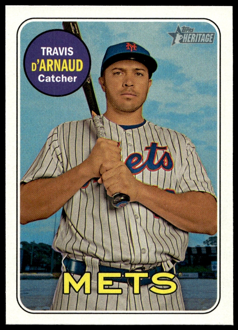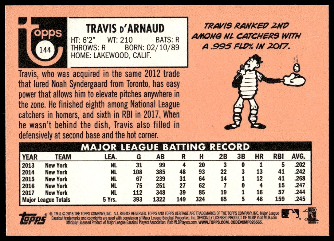 This Baseball card, from 2018 is part of the Topps Heritage card set. Travis d’Arnaud is featured and has a card number of 144.