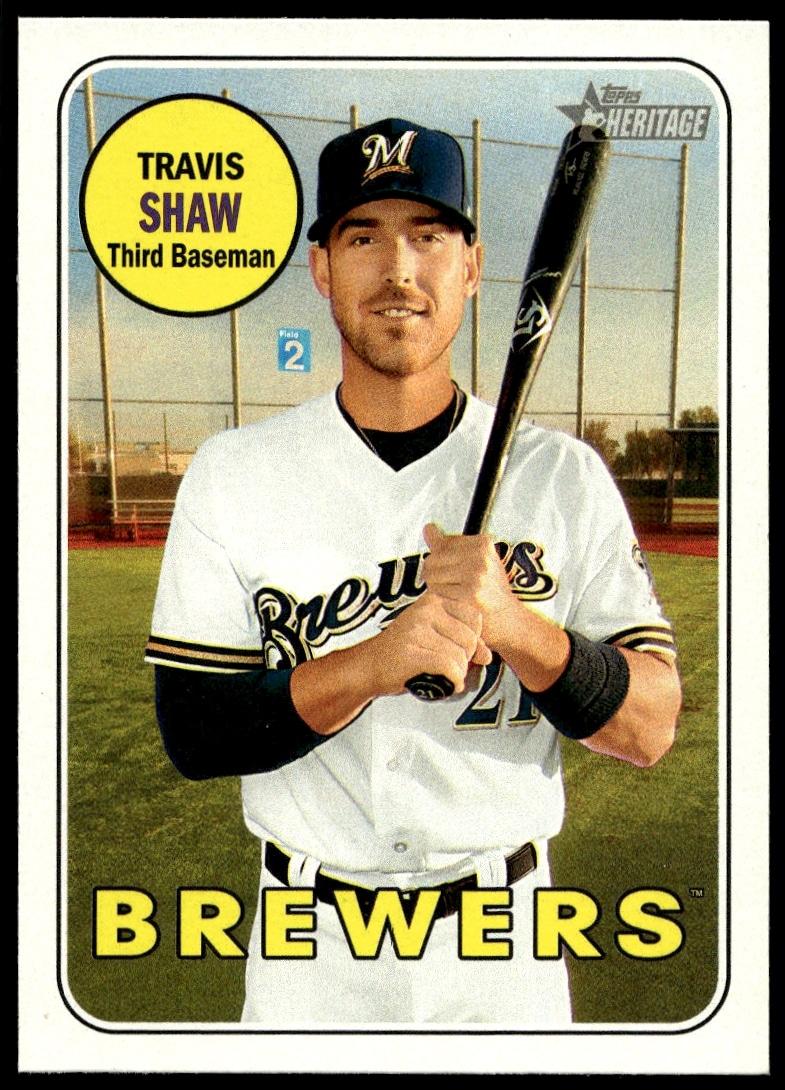 This Baseball card, from 2018 is part of the Topps Heritage card set. Travis Shaw is featured and has a card number of 204.
