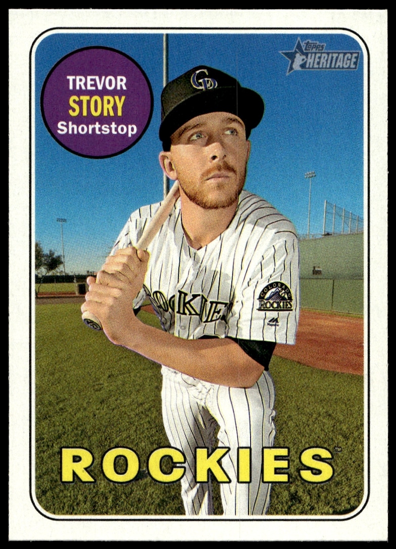 This Baseball card, from 2018 is part of the Topps Heritage card set. Trevor Story is featured and has a card number of 276.