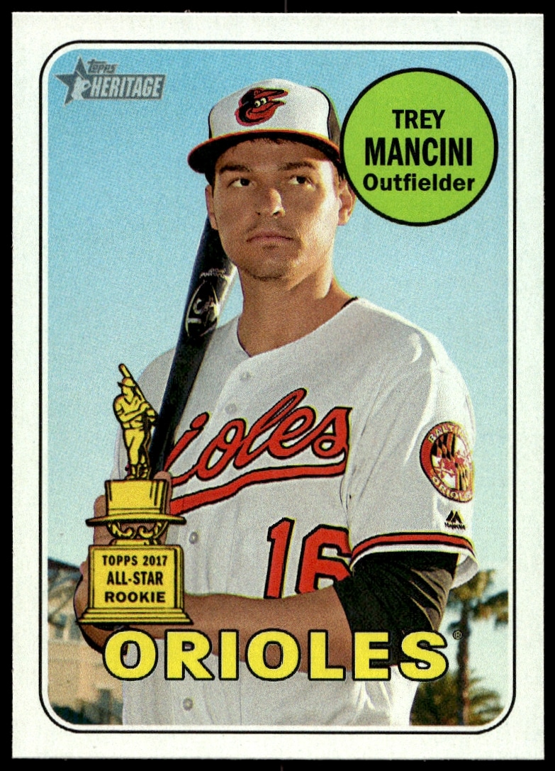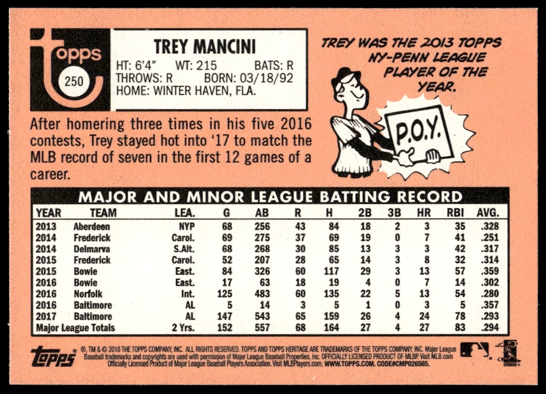 This Baseball card, from 2018 is part of the Topps Heritage card set. Trey Mancini is featured and has a card number of 250.