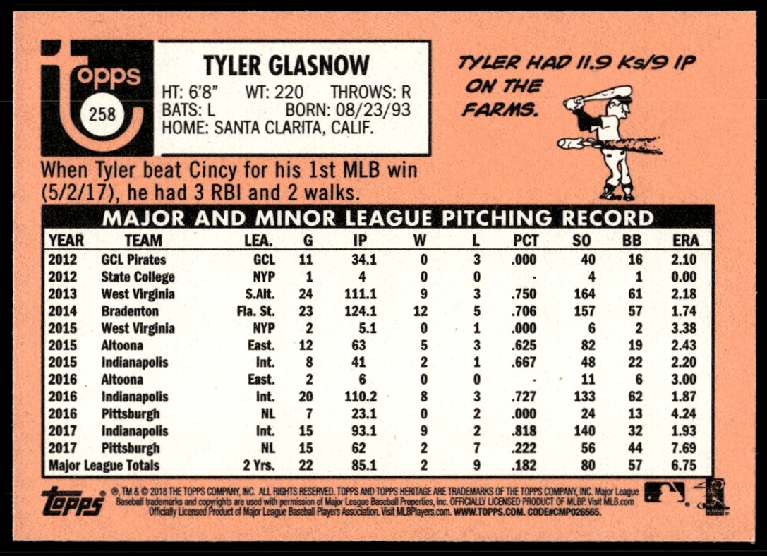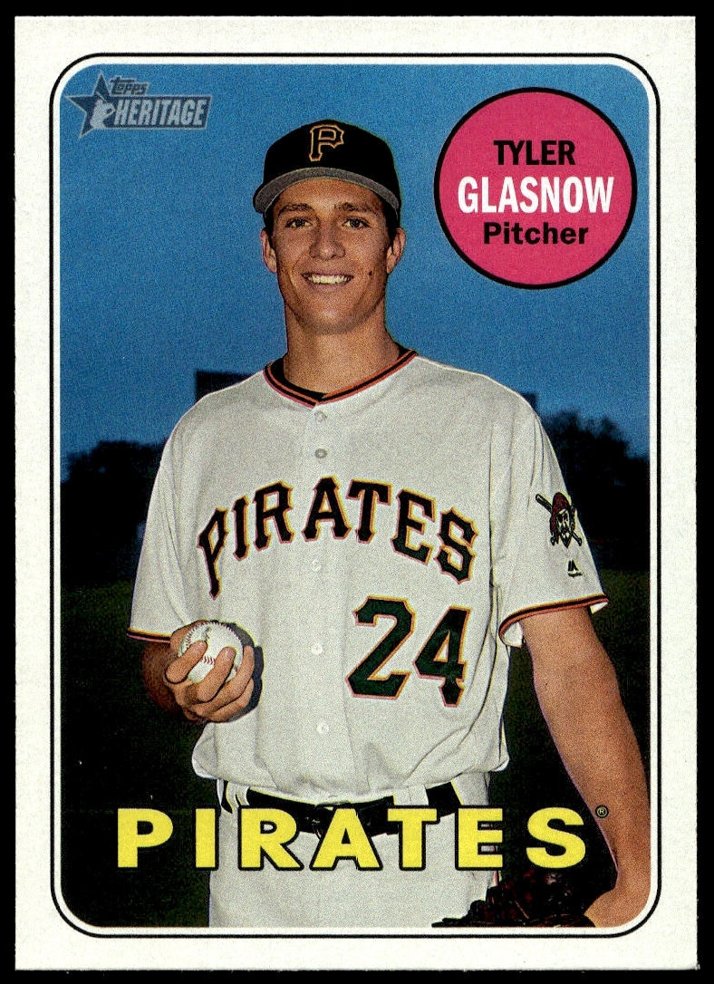This Baseball card, from 2018 is part of the Topps Heritage card set. Tyler Glasnow is featured and has a card number of 258.