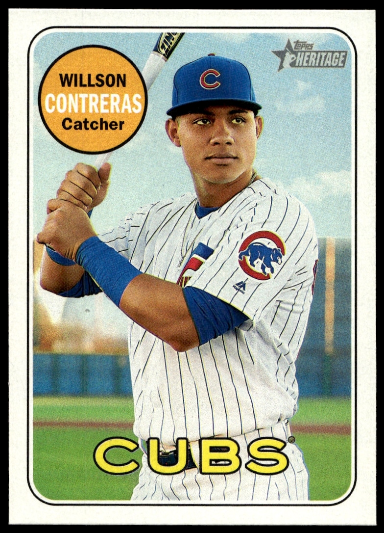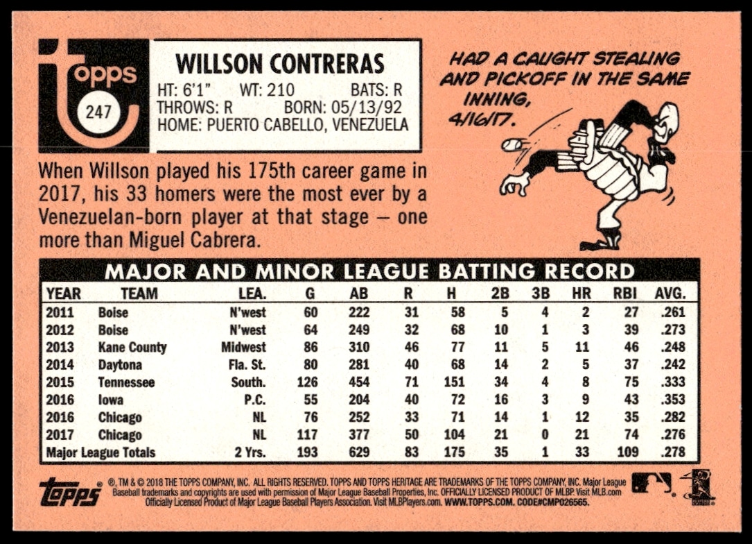 This Baseball card, from 2018 is part of the Topps Heritage card set. Willson Contreras is featured and has a card number of 247.