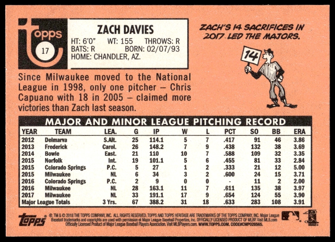 This Baseball card, from 2018 is part of the Topps Heritage card set. Zach Davies is featured and has a card number of 17.