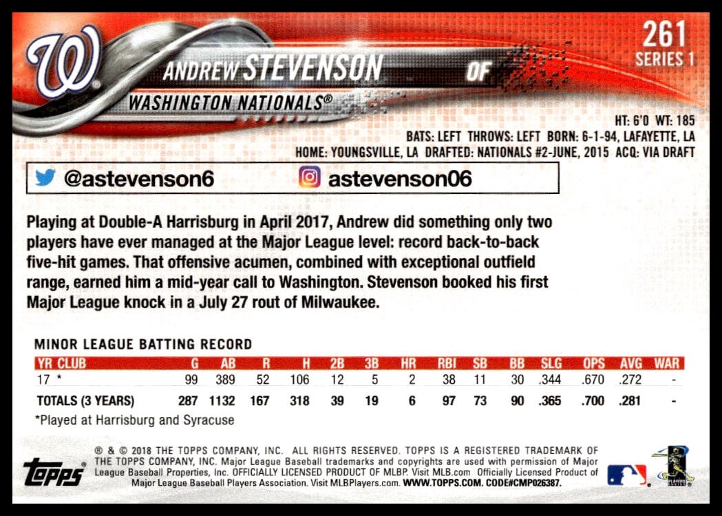 This BaseballΒ card, from 2018 is part of the Topps Series 1Β card set. Andrew Stevenson is featured and has a card number of 261.