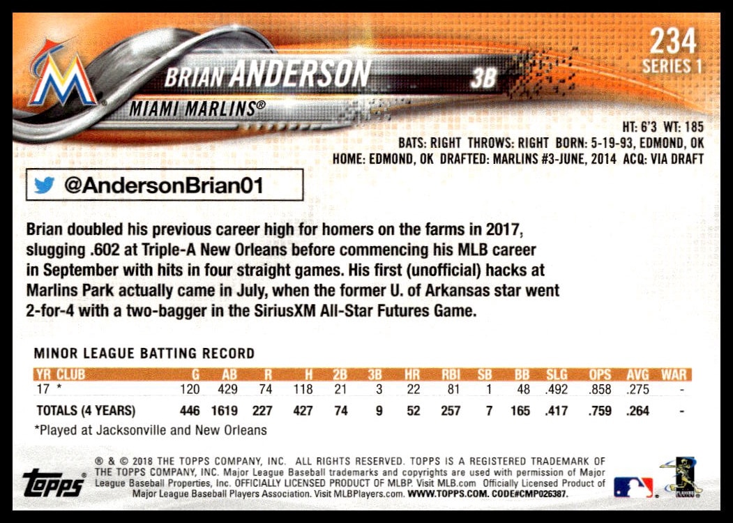 This Baseball card, from 2018 is part of the Topps Series 1 card set. Brian Anderson is featured and has a card number of 234.