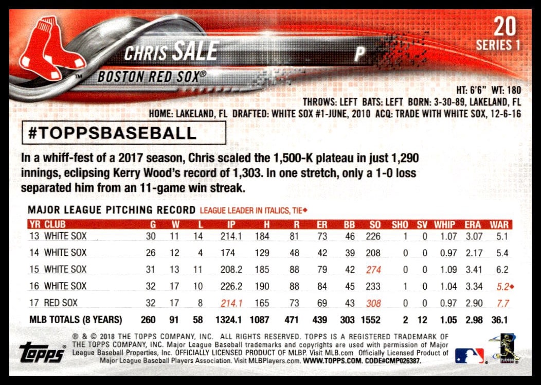 This BaseballΒ card, from 2018 is part of the Topps Series 1Β card set. Chris Sale is featured and has a card number of 20.