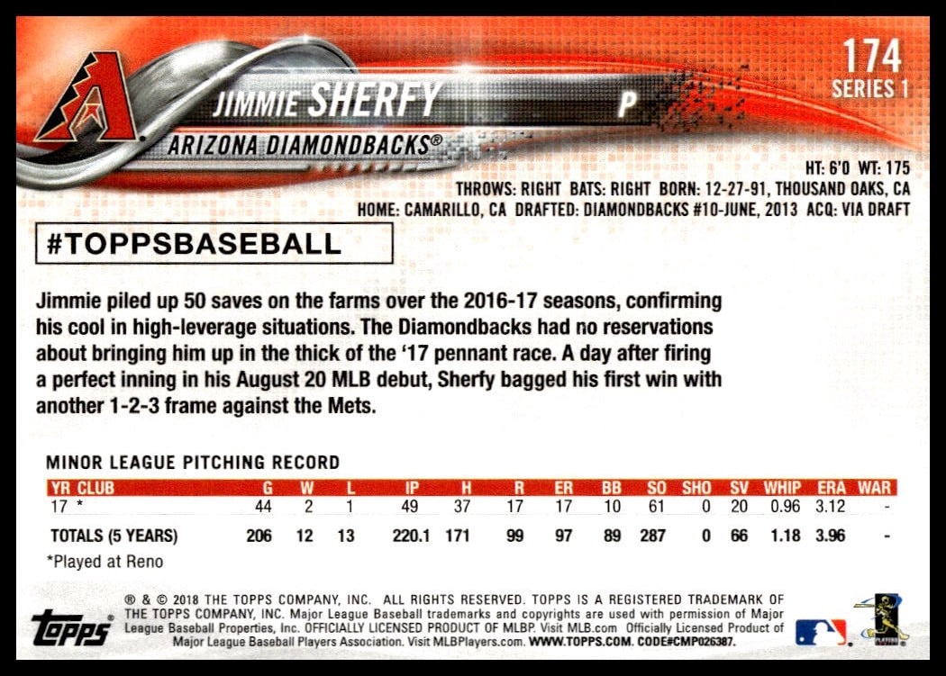 This BaseballΒ card, from 2018 is part of the Topps Series 1Β card set. Jimmie Sherfy is featured and has a card number of 174.