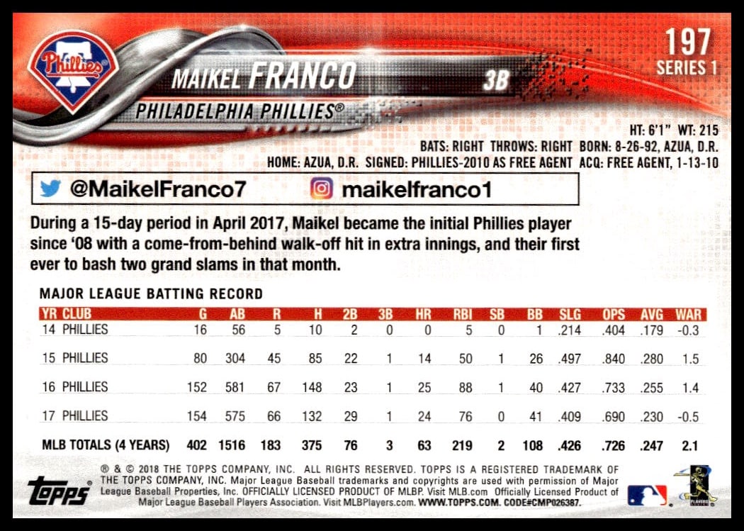 This BaseballΒ card, from 2018 is part of the Topps Series 1Β card set. Maikel Franco is featured and has a card number of 197.