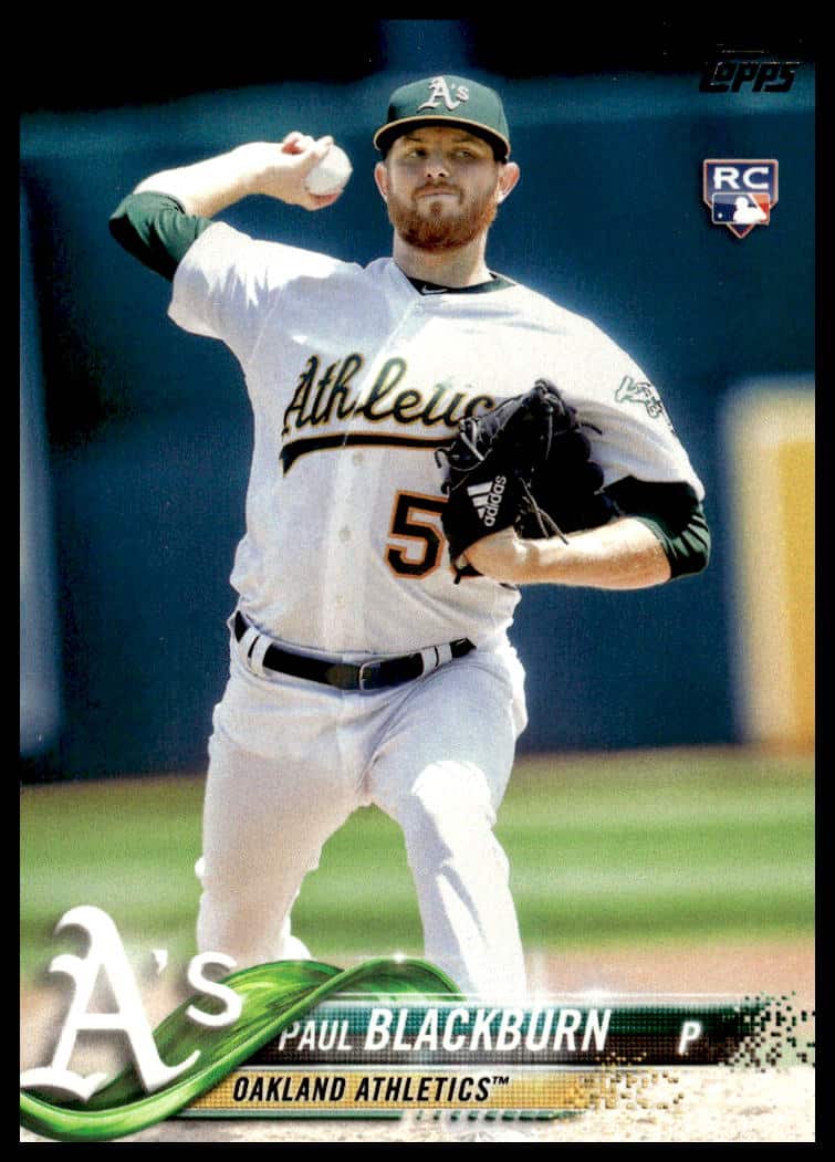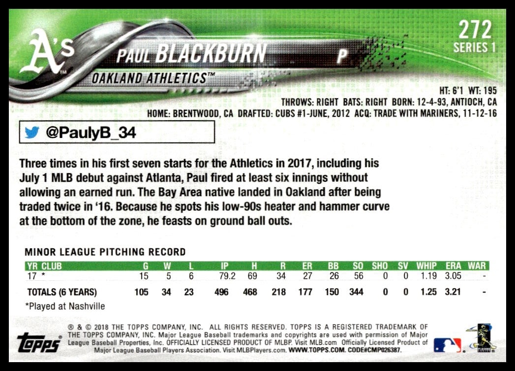 This Baseball card, from 2018 is part of the Topps Series 1 card set. Paul Blackburn is featured and has a card number of 272.
