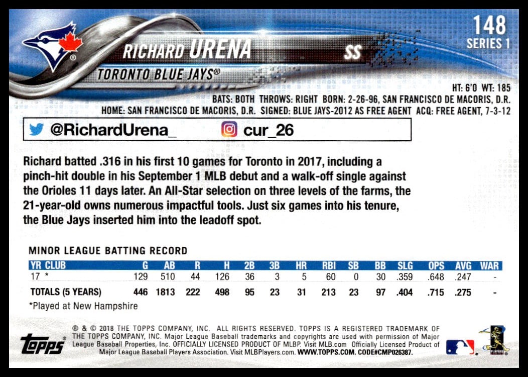 This Baseball card, from 2018 is part of the Topps Series 1 card set. Richard Urena is featured and has a card number of 148.